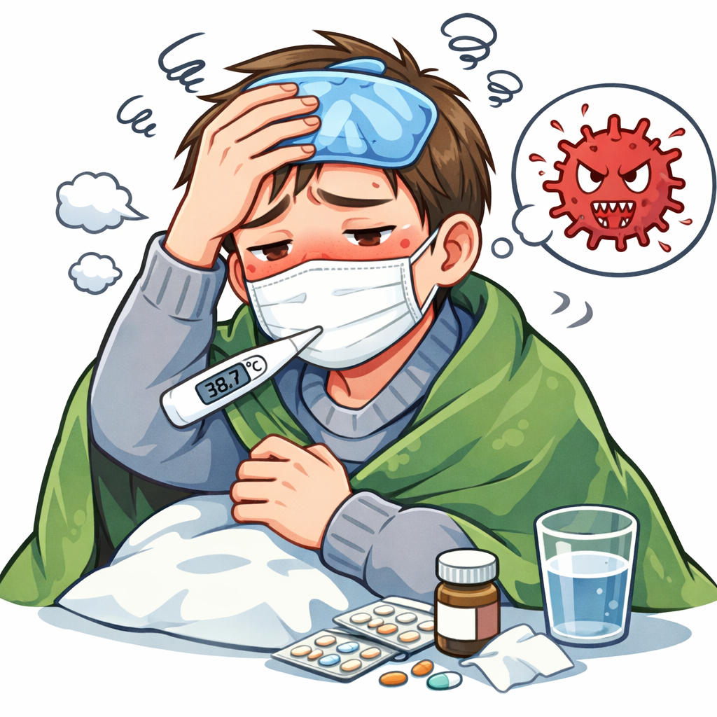 もし、高い熱、体がとてもだるい、のどや体がいたいと感じたら、インフルエンザかもしれません。そんなときは、がっこうや仕事に行かないで、家で休みましょう。