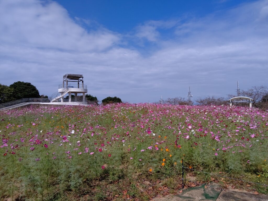 中尾山公園は標高約333mに位置し、頂上の展望台からは不知火海や島々、晴れた日には雲仙の山々まで見渡せるパノラマビューが自慢です。駐車場と展望台をつなぐスカイロードからコスモス園を見下ろす景色も美しく、カメラを片手に歩く散策が楽しいポイントです。