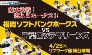 日本職棒球隊 福岡軟銀鷹(Fukuoka SoftBank Hawks) 將於 4月25日(星期六) 在 熊本・Livwork 藤崎台球場 與 千葉羅德海洋(Chiba Lotte Marines) 展開對戰。 http […]